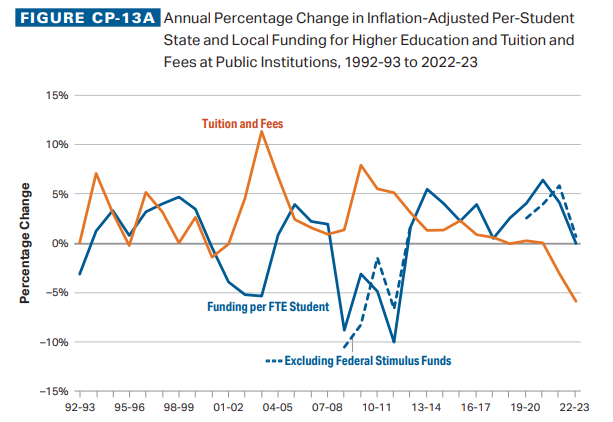 And first-time full-time public two-year college students have received enough aid to cover their tuition and fees since 2009-10. Over the last 30 years, total state and local funding increased by 54% after adjusting for inflation, total public FTE enrollment increased by 25% and funding per student increased by 23%.