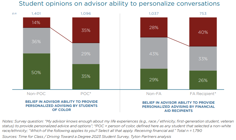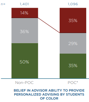 While 70% of students reportedly value representative diversity among advisors, only 30% of institutions report approaching the concern with a systematic approach. This possible disproportion in student and adviser diversity may lead to why people of color (POC) feel less likely to agree that they can receive personalized advising from their resources.